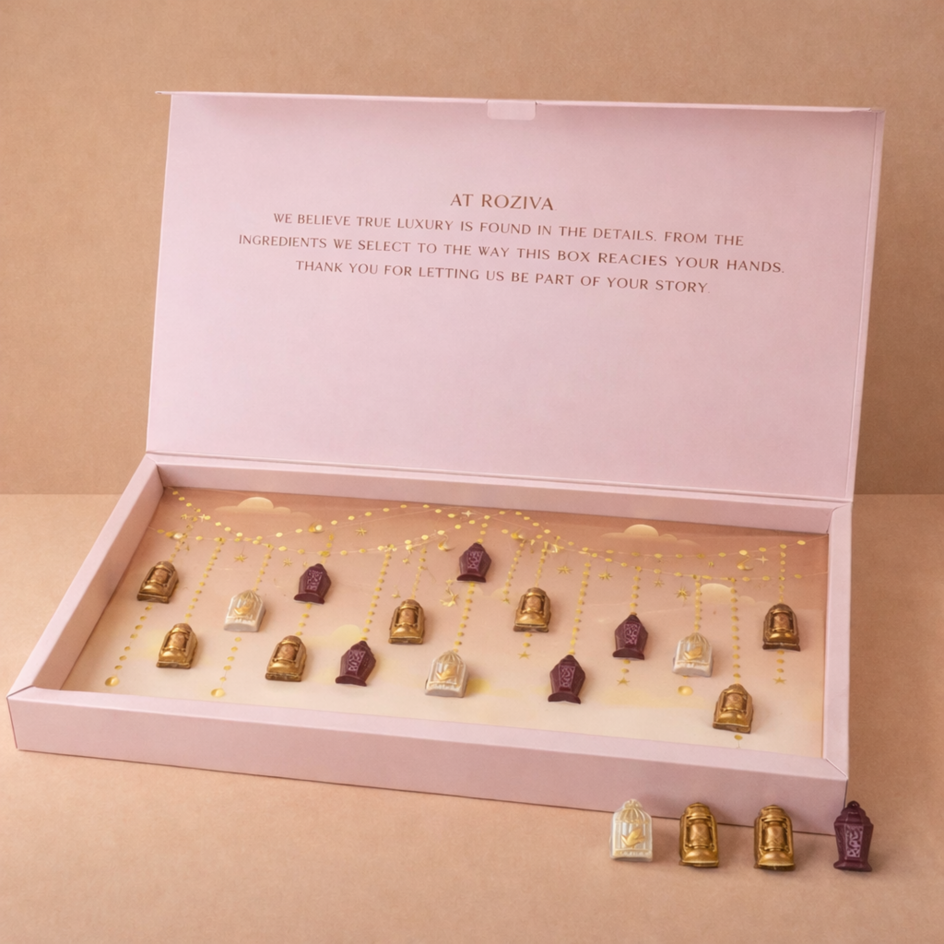 Indulge in the luxury of Ramadan with our special bundle package. Purchase 2 exquisite Roziva Ramadan chocolate boxes and receive 1 premium Fanous Bar absolutely free!